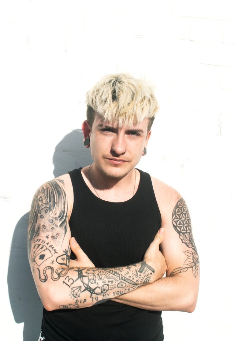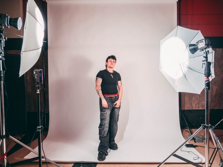 Adrian Sweeney Golano standing on a white backdrop, on a photoshoot set in Bank Plain with lights either side of him.